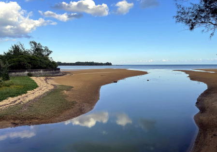 先週とぅ同ぬ潟原どぅやしが、よおいくうてん、別ぬ所から眺みいねえ、又、変わとお景色なてぃ見いゆん。左むてぃいやまんぐらぬ山んでえからぬ水ぬ流りてぃ来ゅうる川なとおん。引潮ぬ時間ぬ当たらな、潟潮ぬ見だらんばすお、うんな景色やてぃん眺みてぃん、しゅぞうなゆん。泳じゅしびけんが海ぬ楽しみえあらん、景色眺みたい、浜ぬ蟹小とぅ遊だいすしん又楽しみやあらに。他ぬ潟原ねえ、埋み立てぃらってぃ街んかいけえ成たい、橋ぬ架きらったいし、景色ぬ相変わとおる所んあしが、くまあ、うぬ侭ぬ形さあに、残しい欲しゃんでぃ思ゆん。今ぬ世やどぅくだら、銭ぬ力ぬ強さぬ銭ぬ勝手けえ成とおん。肝心ぬ豊かさぬ勝ゆる世なゆしえ何時がやら。筆:比嘉清。語句説明→他サイトブログへ行きます。